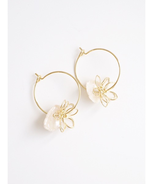 ・ワイヤーを使用した華奢なフープピアス。・動くたびお花とパールがゆらゆら揺れるデザインで とても可愛いです。・普段使いから、きれい目のシーンまで 大活躍できるアイテムです。