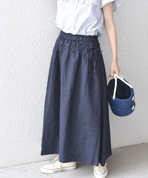 ◆ギャザーディテールとリボンがかわいい 履き心地抜群のロングスカート◆ 〈ウォッシャブルアイテム〉 〈デザインポイント〉 ウエスト下のギャザーディテールがポイントのスカート。 中に紐が通っており、シルエットの調整もできます。 サイドのリボンや、贅沢に広がる裾など、程よい華やかさをプラスしてくれるアイテム。 ウエストはゴム仕様なので、ストレスフリーにご着用いただけます! 〈生地・素材のポイント〉 SHIPS anyオリジナルのオーガニックのリネン素材を使用。 清涼感があり、暑い夏にサラっと着用できます。 ご自宅でお洗濯可能な点も嬉しいポイント。 〈コーディネート・その他〉 ロゴTシャツを合わせてカジュアルに、シアーなトップスなどでレディなスタイリングも◎ この夏コーディネートの主役になること間違いなしのアイテムです! 【少しのいいこと】 ~JUST A LITTLE BETTER~ SHIPS anyは人のため、環境のため小さなことでも何かできることから始めます。 この商品はその理念のもと、環境に配慮してつくられています。 POINT オーガニックリネン ※素材の特性上、表面にネップ(部分的に太くなっている)やスラブ(太さにムラがある)などの糸ムラがあります。 ※濃色製品は、着用、洗濯時のスレで表面が毛羽立ち白っぽくなる場合がありますのでご注意ください。 ※濃色製品は、汗や雨等の水分や摩擦により、他の衣類に色移りする場合がありますので、淡色衣類との組み合せはご注意ください。 ※屋外での撮影画像は、光の当たり具合で色味が多少異なって見える場合があります。商品の色味は、スタジオでの詳細画像をご参照ください。 ※末永く愛用頂く為に、アテンションタグ・洗濯ネームを必ずご確認の上、着用又はお取り扱い下さい。 ※画像の商品はサンプルです。 実際の商品と仕様、加工、サイズが若干異なる場合がございます。