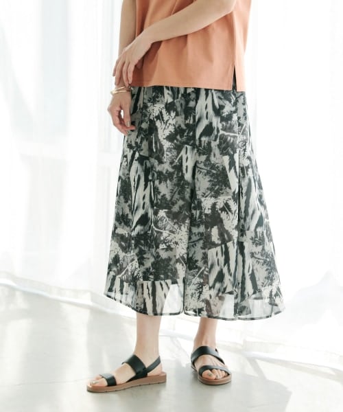 ◆ミックス柄が個性的なプリントスカート抽象的なボタニカル柄とゼブラ柄のコラージュがインパクト抜群のデザイン。色使いを落ち着かせ、マーメイドフレアシルエットに仕上げてすっきりさせたことで大人っぽく決まります。シフォンの軽やかな質感とフレアな裾は動くたびに揺れ、女性らしい印象に。デザインの効いたスカートなので、ベーシックなTシャツやコンパクトなニットでシンプルに合わせるのがおすすめです◎