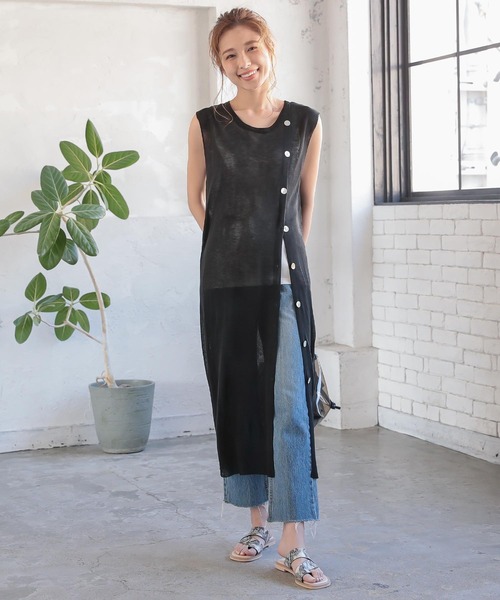 ボタンディテールがアクセントになったニットチュニック。縦に入ったデザインでスタイルアップ効果も◎少しボタンを開けてスカートやパンツをレイヤードしても大人の抜け感ある着こなしが叶います。【素材・サイズ感】肌触り滑らかな質感のニット素材。シアー感のある素材でトレンドムード漂う1枚です。足元まであるロングな丈感も嬉しいポイント。