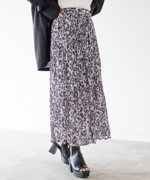 軽く透け感のある楊柳生地にプリントを施したプリーツスカートランダムに入った細めにプリーツに、シックな色合いのレオパード柄で大人っぽく着用いただけます。ウエストゴムでストレスフリーな履き心地も魅力です。※撮影環境により、光の当たり具合で色味が違って見える場合があります。あらかじめご了承下さい。