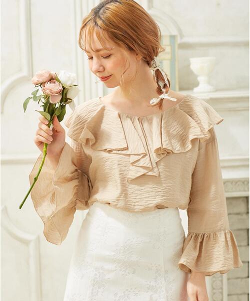 2021 春夏アイテム オンオフ問わずに着回せるブラウスはワードローブの必須アイテム。すっきりと開いたネックラインにボリュームのあるフリルラッフルをプラスしたデザイン性のある1枚です。表面感のある生地はさらとした肌触りで着心地も快適。短めの袖口にもフリルをプラスし、アクセントに。1枚ではもちろん、ジャケットなどのインにも合わせやすいのでシーズン長く着回せます。