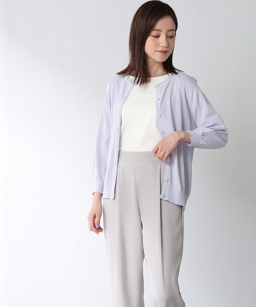 衿ぐりと前立ての配色ラインが 上品な7分袖クルーカーデ。 『UV加工』『接触冷感』機能付きで、気温が高い日でもさらっと着られます。 テーパードパンツやフレアスカートと合わせたきれいめスタイルにも、デニムと合わせたカジュアルスタイルにも、幅広く着回しが利くアイテムです。 品番:646-32-0882 洗濯:手洗い可 ※サイズにつきましては若干の誤差が生じる場合がございます。予めご了承ください。 ※7分袖 ※カーディガンのみの販売となります。
