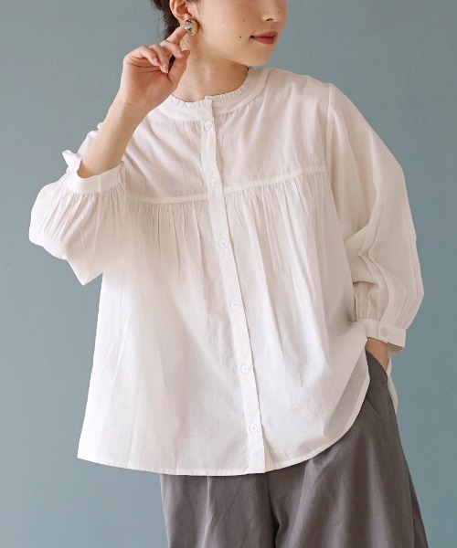 ----------------------------------------------------------------------------<価格改定のお知らせ>2025/02/28より原材料の高騰により価格改定をさせて頂きます。ご了承下さいますよう、お願い申し上げます。----------------------------------------------------------------------------フェミニンだけどきちんと感。ピンタックで見せるクラシカルブラウス繊細なピンタックでデコルテを彩るクラシカルなブラウス。スタンドカラーに小さなフリルをあしらったデザインがポイントです。後ろはボタン開閉でき、前後2WAYで着れるのでコーデの幅も広がります。フェミニンなアイテムなので、カジュアルなデニムやワイドパンツと合わせるのもオススメ!ハリ感のある綿100%素材を使用しており、優しい肌触りで着心地も抜群。洗濯:手洗い可