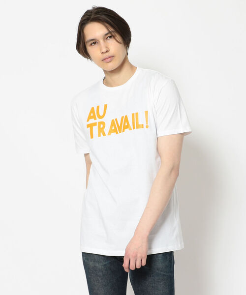 「AU TRAVAIL!」=さぁ 仕事しよう! という意味のフランス語のロゴが前面に入ったデザインです。エムズブラックの人気シリーズ、フランス語のプリントTシャツ。オリジナルのフォントで仕上げたユニークなメッセージロゴが、なんだか気分を上げてくれるアイテムです。【m's braque/エムズ ブラック】デザイナーはパリ在住の松下貴宏氏。コンセプトは「モードとクラシックの間のリアルクロージング」。表層的なデザインだけでなく、カッティングや流れる曲線を大切にし、着心地とデザインを両立。ヨーロッパ各地を回り、ヴィンテージやデッドストックなど現代では再現できない貴重なもの、意匠的な素材や付属を独自のパターンメイキングで表現。艶や色気を大切に、テーラリングをベースにしながら独特の「抜き」が内在する。その圧倒的な背中の美しさ、こだわった「物造り」を追及し独自のスタイルを提案しています。