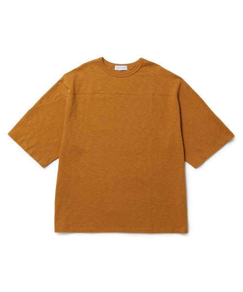 【素材】「拘りのあるヴィンテージのような風合いと程良い肉厚感がたまらない1枚」ムラ感が強いスラブの効いた、程良く肉厚なコットン素材のフットボールTEEです。甘撚りの太番手のスラブ糸で編んでおり、ソフトな風合いが特徴。また、スラブの節がカジュアルな印象の素材になっております。ヴィンテージライクな風合いに拘った生地感なので、カジュアルなアイテムと相性良い1枚です。【デザイン・シルエット】「ストリートでもモードでも。オーバーサイズシルエットの上品さも感じるフットボールTEE」全体的にゆとりを持たせたトレンド感のあるビッグシルエット。衿はバインダーネックの拘った仕様。ヴィンテージにはないアダムエロぺらしい切り替えにより、綺麗めアイテムとの相性も◎袖は5分丈なので、1枚着として主役級の存在感があります。【カラー】色はベーシックな白・スミクロと、ヴィンテージライクなマスタードの3色展開。【おすすめスタイリング】デニムなどオーセンティックカジュアルなアイテムはもちろん、ワイドスラックスなど綺麗めなアイテムとも好相性。-------------------------------------裏地:なし光沢感:なし透け感:なしポケット:なし伸縮性:あり生地の厚さ:普通-------------------------------------【推奨サイズ】サイズM:身長~175cmサイズL:身長176cm~※標準体型を基にした目安になります。