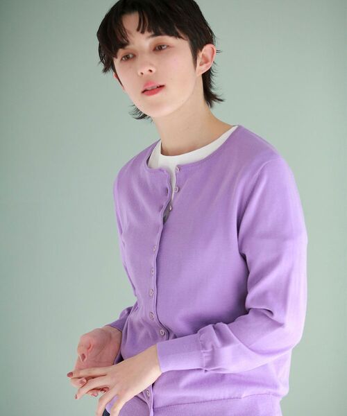 クリアな印象のコットン糸を使用した定番カーディガン。身頃と同色のゴールドトリミングされた小さなボタンを、アクセントになるようにフロントに並べました。春らしいきれいな差し色が並ぶ色展開もポイントです。 モデル:H167 B80 W60 H88