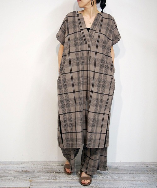 大人顔のダークチェックスキッパーワンピース。 同じ柄使ったパンツの展開をしているので、トレンドのセットアップスタイルがオススメ。ウエストマークをして、ちょっとキレイ目に決めるのも◎同素材パンツ=「チェックパンツ」(品番:12055110)
