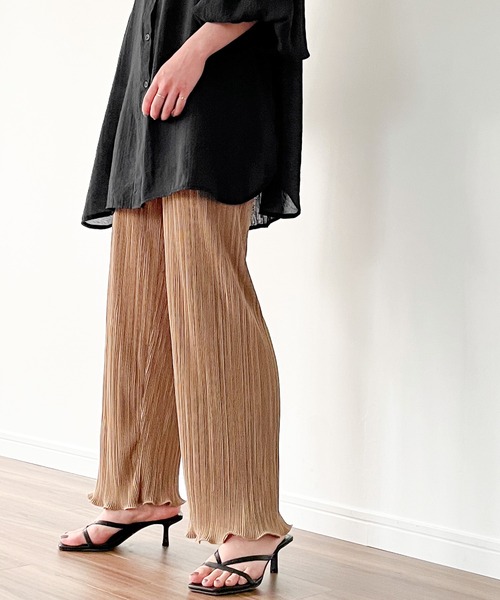 光沢感のある細かいプリーツが上品な雰囲気の裾メロウプリーツワイドパンツ。旬なワイドシルエットにカジュアルになりすぎない女性らしい裾メロウが絶妙にマッチしたデザイン。プリーツの縦ラインですっきり見せてくれるのも嬉しいポイント♪丈の長めなトップスに合わせたり、ウエストにインしたりなど、合わせるだけでこなれ感たっぷりな着こなしに。ウエストゴム入り、程よく伸縮のある素材はストレスなく着られる1本です。★お買いものをよりお楽しみいただく為に!★▼商品のお気に入り登録お気に入りアイテムの完売カラーの再入荷通知や、ラスト1点の通知、セールの通知も受け取ることができます。▼ブランドのお気に入り登録新商品や再入荷など、クーポン配布などのお得な情報を受け取ることができます。※商品画像は撮影時の光や角度により、実物の色味と異なって見える場合がございます。※撮影はサンプル品を使用しており、表示のサイズ感も実物とは若干異なる場合もございますので、予めご了承ください。※生産時期により色・素材・サイズ感など多少異なる場合がございます。予めご了承ください。