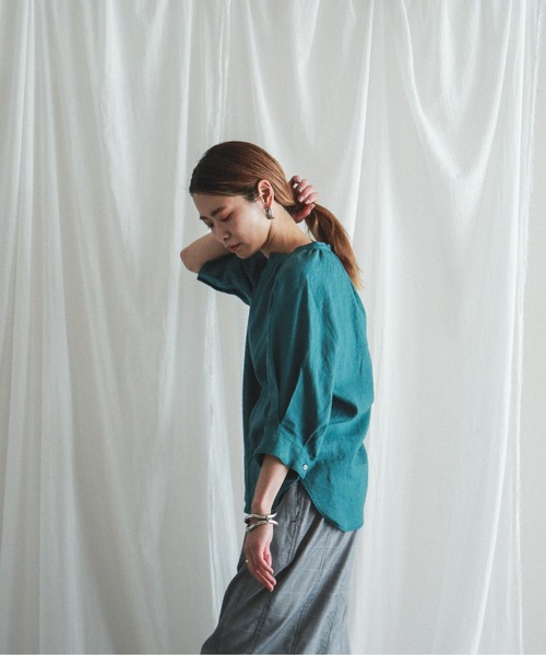 【FIL DE FER フィルデフェール】 ”ドライタッチな麻の風合い” ざっくりとした織を感じる麻の風合い。エアタンブラーワッシャー仕上げの生地で、自然なしわやムラっぽく染まった古着のような風合いがこなれた印象に。 夏も涼しい麻素材は長い期間で着られるのも魅力です。 スタンドネックの一番上は、金属のギボシがアクセント。ヴィンテージのようなデザインや、メタルの質感がモードな印象をプラスします。 落ち着いた深いカラーのパープルとグリーンで、麻独特のナチュラルな雰囲気が抑えられ大人っぽい印象にまとまるブラウス。 シンプルな着こなしで様になる一枚です。 洗濯:ドライクリーニング