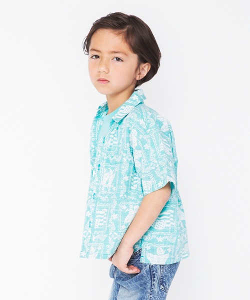 プリントの裏面を表に使用しました半袖シャツです。タテヨコにスラブ糸を使用しプリントにムラ感のあるラフな仕上がりになっております。同じ素材の女児スカートとのペア企画でございます。