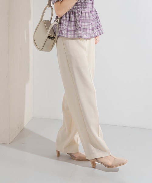 【ミニマルなデザインが嬉しい、ヘビロテ間違いなしの定番スラックス】かっちりしすぎない絶妙なシルエットで、キレイめにもカジュアルにも合わせやすいスラックスが登場。少し落ち感のある素材は抜け感をプラスしてくれます。センタープレスのようなタックで縦のラインを強調し、脚長効果も期待できるデザインです。POINT・抜け感を演出する絶妙なシルエット・定番で合わせやすいデザイン・色違いでお持ちいただくのもオススメな雰囲気の異なるカラーリングCOORDINATE組み合わせるトップスによって雰囲気を変えられるので幅広い活躍が期待できます。ON/OFF問わずにご使用いただける万能アイテムです。-----------------------------透け感 : ややあり(ECRUのみ)伸縮性 : なし裏地 : あり(ECRUのみ)光沢 : なしポケット : あり-----------------------------※商品画像は、光の当たり具合やパソコンなどの閲覧環境により、実際の色味と異なって見える場合がございます。予めご了承ください。※商品の色味の目安は、商品単体の画像をご参照ください。