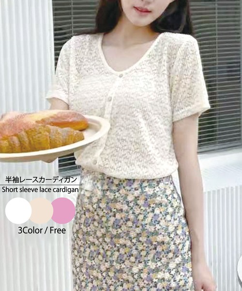 レースが上品で可愛い半袖トップス。 さらさらした生地で着心地も抜群! パンツ、スカート、ワンピースなども幅広くコーデできます。