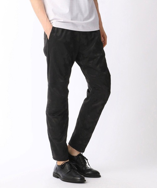 アスレジャー要素の高い立体切り替えのデザインジョガーパンツです。切り替えとダーツを利用して体に沿った立体的なシルエットを形成しています。生地には迷彩柄のジャカードカットソー素材を採用。ポリエステルジャージ素材になりますので伸縮性と軽量感、保形性があります。ジャカード柄はメッシュ調で涼しく、ツルっとした素材は高級感のある光沢があり滑らかで、プリプリしたヨコ張りがあります。速乾性があり、シワになりにくい、イージーケア性も魅力の素材です。※画像の商品はサンプルです。実際の商品とは仕様・加工・サイズ・素材が若干異なる場合がございます。
