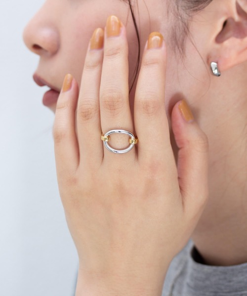 <CYCRO>オーバルモチーフのリングです。 艶感のあるシルバーの丸線で描いたオーバルモチーフを 両端から支えるように、艶感のあるゴールドの平角線で リングラインを描いたデザインです。 丸線と平角線の量感のコントラスト、色の対比でシルエットが 際立ち印象的です。 オーバルに抜け感を出し、さらに着けたときに正面から 見える色の分量を重すぎないように仕上げています。 1つで様になる存在感です。 <about CYCRO>しなやかに時代と呼応しながら 自分らしく歩みを重ねてきた大人の女性のために サイクロは生まれました。 ベーシック(価値)×トレンド( 遊び心)を指針に、 上質で自由なスタイルにふさわしい アクセサリーをお届けします。