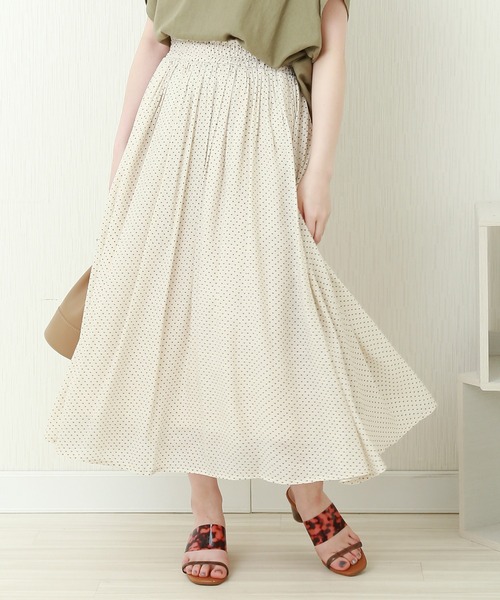 爽やかで上品な小さめドット柄とさらっとした通気性も良いスラブ生地を使ったスカート。 スラブ生地の特徴、触り心地に少し凹凸がある独特な風合いは シンプルな組み合わせになりがちな春夏のコーデのアクセントになります。 上品な広がりのフレアシルエットとウエストフリルデザインは女性らしい印象に。 歩くたびに軽やかに広がりすぎず、美しく動きます。 更にウエストがゴムなので穿き心地楽ちんです。 ※屋外の光や照明の当たり具合、パソコンなどの閲覧環境によって実際の色味と異なって見える場合がございます。 予めご了承ください。