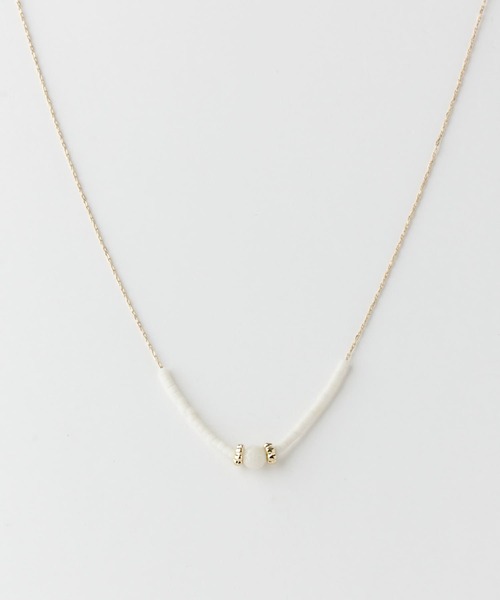 きれいなカッティングが施された天然石の周りには、ビーズ状のパーツをバランスよくきれいなラインになるよう配置。さりげなく首元に華やかさを生み、デコルテラインをきれいに見せてくれます。[モチーフ] one : 全長5.1cm / 最大幅0.4cm