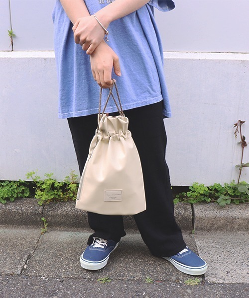 リアルレザーさながらの柔らかい質感が魅力のヴィーガンレザーを使用。【STYLING】シンプルなスタイリングのアクセントに最適です。デイリーユースだけでなく、シワにもなりにくいので旅行などの際の持ち運びにも便利です。【DETAIL】巾着バックとしてはもちろん、付属のストラップを取り付けてショルダーバッグとしてもお使い頂ける便利なミニバッグです。ストラップの長さ調整可能です。※店頭及び屋外での撮影画像は、光の当たり具合で色味が違って見える場合があります。 商品の色味は、スタジオ撮影の商品画像をご参照ください。※撮影場所やお使いのモニター環境により若干お色味が異なる場合がございます。