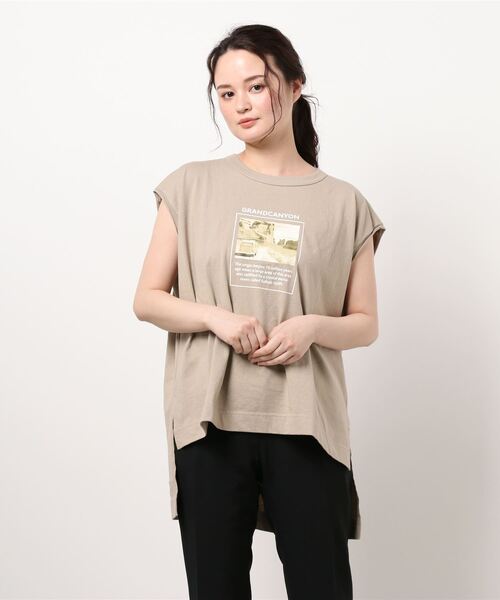フォトプリントがかわいいノースリーブカットソー。ゆったりとしたシルエットで前後差と裾のスリットがポイント。後ろはお尻が隠れる丈感なので世代問わず気軽にコーディネートが楽しめるアイテムです。