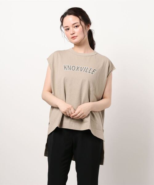 ロゴプリントがかわいいノースリーブカットソー。 ゆったりとしたシルエットで前後差と裾のスリットがポイントです。 後ろはお尻が隠れる丈感なので世代問わず気軽にコーディネートが楽しめるアイテムです。
