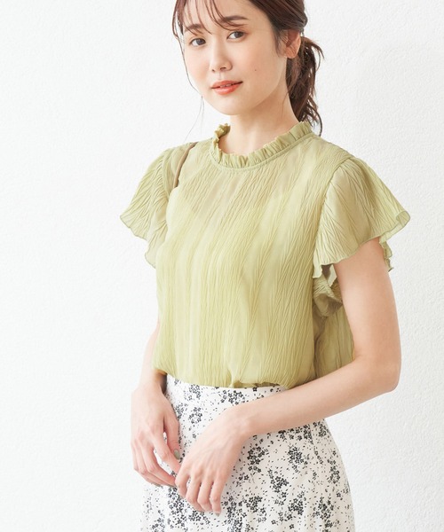 ランダムプリーツでコーデに表情がつけられる。【素材感】 ・シアー感のあるシフォンプリーツ加工を施したアイテム。 【デザイン・シルエット】 ・ランダムプリーツで透け感を抑えたシフォンブラウス。 ・前後逆に着られる2WAY仕様。 ・WEBストアのみの展開商品。 【カラー】 ・ベーシックカラーとポイントカラーを交えた4色展開。 【スタイリングポイント】 ・ジーンズに合わせてカジュアルダウンすると普段使いに。 ・きれいめなワイドパンツに合わせるとオフィス仕様に。 ----------------------------- 裏地:なし 透け感:あり 伸縮性:あり 生地感・厚さ:薄手 季節:夏 ----------------------------- ※撮影時の光、お使いのモニター環境によって色の見え方が違う場合がございます。 : □■着用レビュー■□ 〈スタッフA〉 身長:151cm 普段の着用サイズ:36(S) 着用サイズ:38 サイズ感:肩が隠れるフレンチスリーブです。丈は長すぎないので、アウトで着ても綺麗です。 素材感:薄いブラウス地です。透けるので、キャミソールが必須です。フィッシュボーンのようなランダムプリーツのデザインになっています。 着心地:柔らかく軽い着心地です。プリーツなので、横に伸びます。 おすすめコーデ:フェミニンなブラウスなので、カジュアルパンツと合わせるとラフな印象でお召しいただけます。ジャンパースカートやキャミワンピのインナーとしても使えます。 〈スタッフB〉 身長:165cm 普段の着用サイズ:38(M)または40(L) 着用サイズ:38 サイズ感:フレンチスリーブでふんわりとしたシルエットです。 素材感:シアー素材なので少し透け感があり女性らしい印象です。インナーにキャミソールを合わせると安心です。 着心地:さらっとして軽い着心地です。 おすすめコーデ:キャミワンピースにインしたエレガントなコーデがおすすめです。ランダムプリーツで動きが出るので、シンプル過ぎずお洒落です。