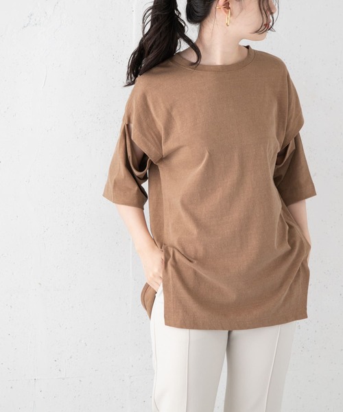 アーム部分にスリットが入った今年らしいデザインTシャツ。普通に袖を通すだけでなく、スリットから腕を出したりすると雰囲気が変わって◎腰回りが隠れるルーズなシルエットは体型カバーが期待出来ます。大人っぽさを演出する落ち着いたカラーリングにも注目です。 ※透け感あり ※この商品は、摩擦や汗、雨などの使用条件等により、色落ちや他の物への色移りの可能性がございますのでご注意ください。 ※洗濯により、多少の伸び縮みやよじれが生じることがあります。 ※その他お取り扱いに関しましては、商品に付属のアテンションタグをご覧ください。 ※モデルの着用画像の場合、光の当たり具合により、実際の色味と異なって見えることがございます。色味は、商品単体の画像をご参照ください。 モデル身長:164cm 着用サイズ:one 洗濯表記:洗濯機洗い可 ※詳しい洗濯方法については、商品の品質表示タグをご覧ください