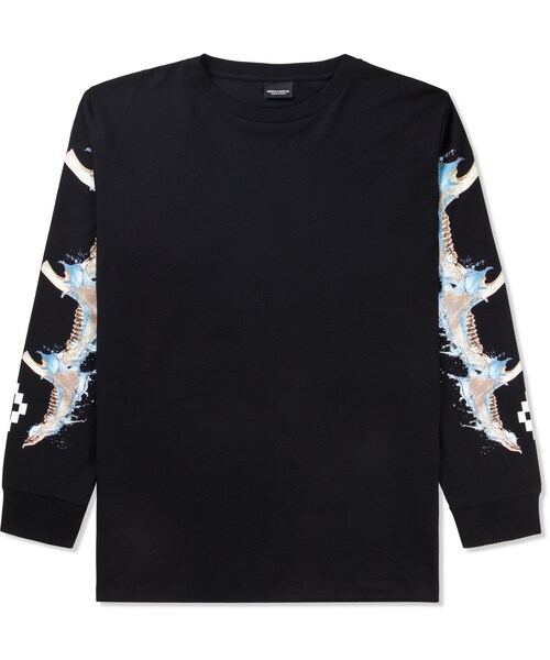 Italian designer, Marcelo Burlon, uses T-shirts as the canvas for a vision that draws from a variety of cultures and symbols. His graphic designs and bold motifs are both visually-arresting and thought-provoking and are intended to engage the wearer’s imagination. Cotton long-sleeved crewneck tee with printed graphics. Available now in black.