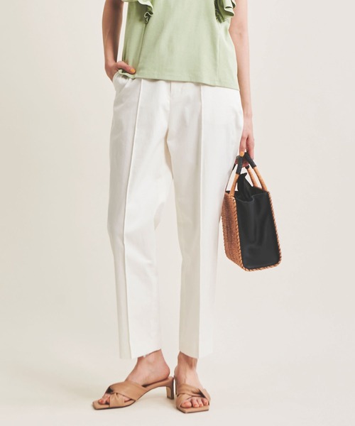 ・美人百花 6月号掲載◆快適な着心地のカラーチノパンツ高混率のコットンがさらりとしたドライな風合いを醸し出すカラーチノパンツ。ハイウエスト仕様と、適度なゆとりをもたせながら裾に向けてほっそりとさせたテーパードシルエットで脚長効果を追求。きれいめなシルエットとカジュアルな風合いのバランスがこなれた印象をメイク。伸縮性に優れたストレスフリーな着心地はデイリー使いにぴったり。※裏地はオフホワイトのみに付いており、ブルーには付いておりません。【洗濯表示について】洗濯処理はできません漂白処理はできませんタンブル乾燥禁止底面温度110℃を限度とし、スチームなしでアイロン仕上げ石油系溶剤(蒸留温度150℃~210℃引火点38℃~)でのドライクリーニング処理ができる:弱い処理ウエットクリーニング処理はできません※画像の商品はサンプルです。実際の商品と色味、仕様、加工、サイズ、素材等が若干異なる場合がございます。※アイテムサイズは商品サンプルを採寸しているため、実際の商品と多少の誤差が生じる場合がございます。※末永く愛用頂く為に、アテンションタグ・洗濯ネームを必ずご確認の上、着用又はお取り扱い下さい。※屋外での撮影画像は、光の当たり具合で色味が違って見える場合があります。 商品の色味はスタジオ撮影及び物画像をご参照ください。