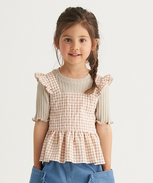 【#プチプラ NEWアイテム♪】 ギンガムチェック柄のキャミをレイヤードしているみたいなトップスです。一枚でコーデが完成する手軽さが活躍の秘訣♪ スリーブは少し長めに設定して華奢見えを実現。ワントーンでまとめているので、どんなボトムス合わせもおしゃれにきまります。内側にはお名前を記入できるタグつきです。