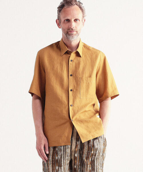 羽織りとしてもコーディネートできるボックスシルエットのショートスリーブシャツ。ウエイトのあるしっかりしたハイカウントリネンが男性的な印象を演出。全体をすっきりと見せる前後差のあるスクエアカットの裾もポイントです。MADE IN JAPAN■素材高密度に織り上げたトロピカルリネン。コシのある素材感は洗いざらしでも表情豊かな印象で着用可能です。シーズンのムードを意識したニュアンス感のある3色展開。■デザインほど良くボリューム感を持たせたショートスリーブシャツ。若干肩線が落ちるドロップショルダーやボックスシルエットなど、大人が着るにふさわしい控えめなリラックスフィット。全体をすっきりと見せる前後差のあるスクエアカットの裾もポイント。羽織りとしてもおすすめのアイテムです。NAVY OFF2021SS商品店舗にお問い合わせの際は、下記の商品番号をお申し付けください。商品番号:61-05-12-05001