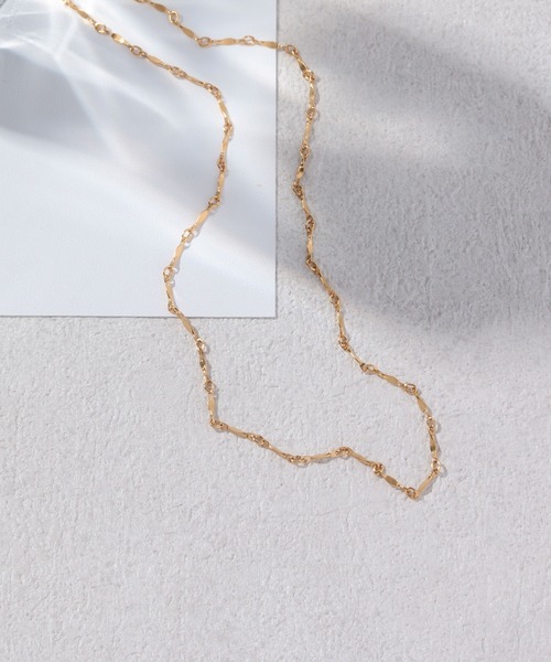 K14ゴールドフィルドの素材を使用した、デザインチェーンネックレス【素材、機能、加工】汗ばんでくる季節に、素肌に触れることを考えて、ゴールドフィルド素材を使用したアイテムです。※ゴールドフィルドとは?主に真鍮などの合金を芯として、総重量の5%に相当する量の金(主に14金などの金合金)をコーティングした素材で「金張り」とも呼ばれるものです。ゴールドフィルドは金メッキ(ゴールドプレイテッド)と比較して、金によるコーティングの層が遥かに厚いうえ、熱と圧力を加えてコーティングを圧着していることから、金メッキのようにすぐに皮膜が剥げてきてしまうような心配は殆どありません。耐久性に優れるゴールドフィルドは、アクセサリーパーツなどの宝飾品や装身具の素材として高い人気を誇ります。【デザイン・シルエット】同シリーズの中で一番太さのあるチェーンネックレスです。存在感があり、1本で決まるひとくせある笹の葉のようなデザインチェーンがポイント。Tシャツなどカットソーにラフに合わせるのがオススメです。【カラー】上品なゴールド1色展開。【その他ポイント】14金ゴールドフィルドを使用したネックレスシリーズ・K14GF フィガロチェーンネックレス(品番:GGZ21140)・K14GF スウェッジチェーンネックレス(品番:GGZ21150)・K14GFデザインチェーンネックレス(品番:GGZ21160)・K14GFメダルトップネックレス(品番:GGZ21170)がラインナップ。※画像の商品はサンプルです。※室外で撮影している画像は、光の影響で色味が若干異なって見える場合がございます。※商品の入荷状況は、店舗までお問い合わせをお願いいたします。店舗での商品のお取り扱いについてROPE'の商品は、ROPE'実店舗のみの取り扱いになります。