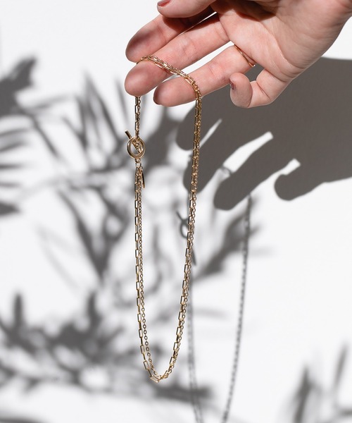同じ長さの異なるデザインのチェーンを2連にしたショートネックレスです。 接続部分のパーツを前にみせてもかわいいです。付けやすく、そして外しやすいのも嬉しいポイント。存在感のある2連ネックレスですが細めのチェーンなのでデイリーユースに使いやすいです。カジュアルなボーダーやなTシャツ合わせや、シンプルなスタイルのポイントにおすすめです。