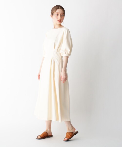 リネンライクな杢感のある素材を使用した、デザインワンピース。 【素材】 リネンライクの杢感と表面感のある素材を使用しています。 シンプルなワンピースなので素材感で華やかな印象に仕上げました。 【シルエット】 腕まわりはドルマンデザインでゆったりと、ウエスト周りをタックできゅっとさせた フィットアンドフレアのシルエット。 華やかなシルエットと一枚でスタイリングが完成する一着に。 【こだわり】 リネンライクな合繊素材なので季節をあまり問わず着て頂けるのもポイント◎ ウエストのタックでパターンにこだわったきれいなシルエットに。 マシンウォッシャブル機能つき。 ※ポケット数:横×2 ※裏地なし ※オフホワイト(003)はやや透け感があるため、インナーの着用をおすすめします。 こちらの商品は主に夏に着用いただける商品です。 モデル情報:身長166cm B72 W57 H84 着用サイズ:38(M) 店舗へのお問い合わせ商品番号:N02-52310 ●製品寸法: 36(S):着丈114cm B88cm 裄丈54cm W68cm H104cm 38(M):着丈116cm B94cm 裄丈57cm W72cm H108cm 備考: