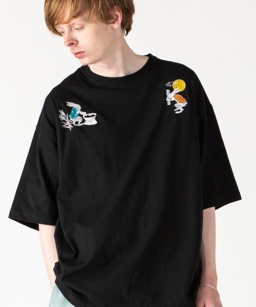 【 生地 】 程よい肉厚のある天竺にシルケット加工を施し、肌触りを滑らかにした素材を使用しています。しっとりとした質感でインナーとしても快適な着心地が体現できます。【 デザイン・シルエット 】その名の通り”お月見"テーマにスカジャンを彷彿させるようなうさぎの刺繍を施したカットソーです。針の打ち込み数をわざと減らしあまめに刺繍することで表情が柔らかくなるように加工しています。刺繍は国内で熟練の職人により施されています。サイズ感は肩線を落とし、流行のオーバーサイズを取り入れたユニセックス対応のボックスシルエットになっております。少し長めの袖丈で落ち感のある雰囲気を演出しています。