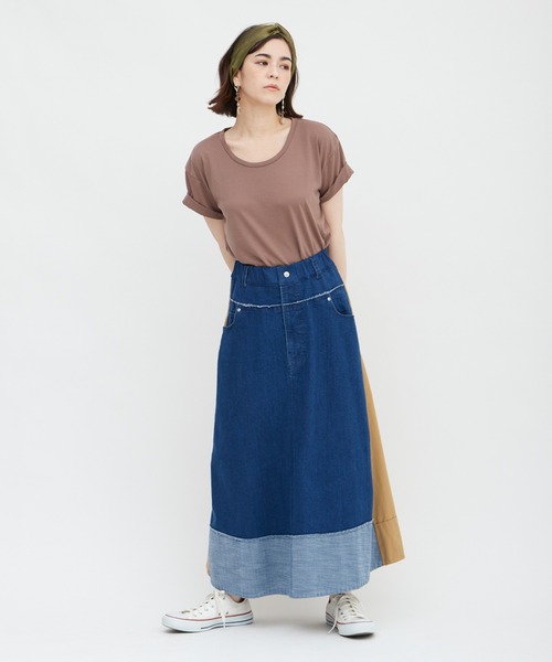 メリハリを効かせた異素材切り替えが視線を集めるデニムスカート。 ゆるやかなフレアシルエットがカジュアルなデニム素材を大人に整え、どこか女っぽさもキープしてくれます。 スニーカーはもちろんパンプスにも合わせやすく、幅広いコーディネートに活躍してくれること間違いなしの1枚。 着崩さずとも抜けて見え、いつもとはひと味違う新鮮なムードを演出できそうです。 ・・・・・・・ 透け感:なし 裏地:なし 伸縮性:なし 生地の厚さ:普通 ケア方法:手洗い・ドライクリーニング ・・・・・・・ ※商品画像はサンプルのため、色味やサイズ等の仕様に変更がある場合がございますので、予めご了承ください。