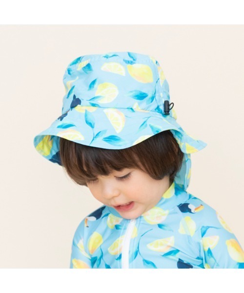 フレッシュなレモンが全体を彩るハットです。自然な雰囲気ただよう鳥のオオハシも組み合わせてアウトドア感満載に♪ 紫外線をカットする素材や日よけ布を備えているので、UVケアアイテムとしても重宝。内側には帽子内のムレを軽減するメッシュ素材をあしらいました。あごヒモつきなのもうれしいポイントです。