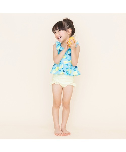 インパクトのあるオオハシ×レモン柄を採用したさわやかムードたっぷりなセパレート水着です。上下がそれぞれ離れているため、お手洗いやお着替えがスムーズ♪ 要所にあしらったフリルは、女の子にぴったりな可愛らしい雰囲気を演出します。紫外線カットに優れた素材を仕様しているので、日焼けしにくく安心です。