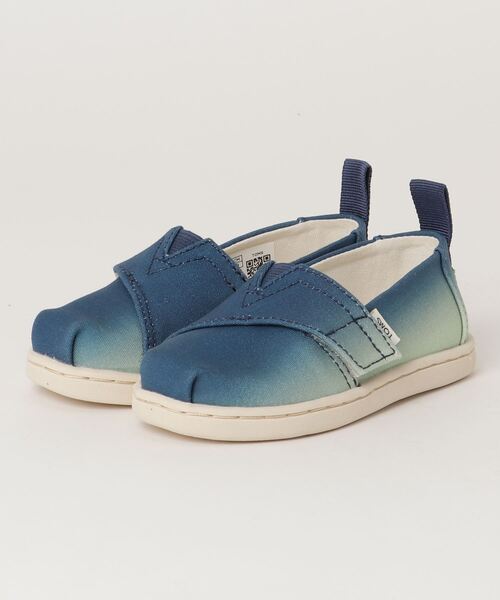 100%オーガニックコットンのアッパー。デジタルプリントによりグラデーション染料効果を備え印刷後の洗浄が不要-水とエネルギーの使用量を削減し環境に配慮。 Tinyは足を入れやすくするため調節可能なベルクロストラップデザイン。 キャンバスフットベット 屈曲性の高いラバーアウトソール かかとを上げやすいヒールストラップ付