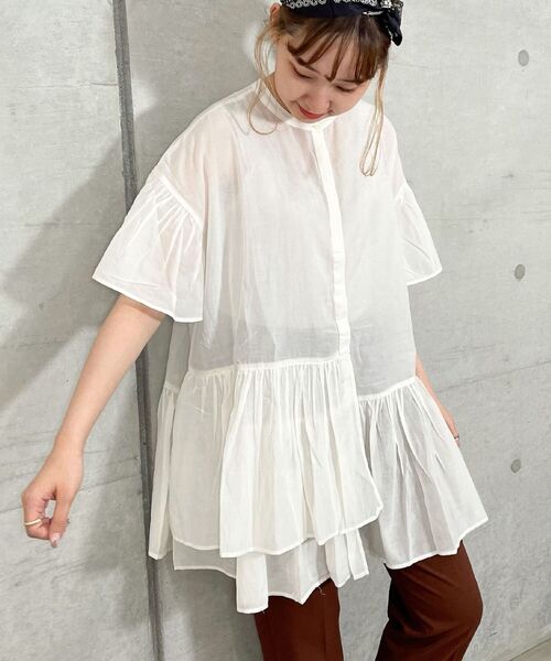 ◇FREDY REPIT◇ 【2021SS】 大人かわいいスタイリングに仕上げてくれるティアードロングブラウス ●ふわっと可愛いボリューミーなシルエットがコーデに華やかさを加えてくれるブラウス。 ●バンドカラーにすることですっきり感と上品さをプラスしました。 ●ふんわりと広がるティアードシルエットで体のラインを拾わずリラクシーにご着用いただけます。華奢見え効果も◎ ●ボタンを開けると羽織りとしても着用できるので、幅広い着こなしを楽しめる1枚です。 コーディネート ボリューム感のあるシルエットなので細身のパンツやタイトスカートと合わせるとすっきり着ていただけます。 1枚でも、ニットベストやプルオーバーのインナーとしても使えるアイテムです。 透け感:あり 裏地:なし 伸縮性:なし 光沢感:なし 生地の厚さ:薄手 ●お取扱い上のご注意● *アテンションタグを必ずご確認の上、着用又はお取り扱い下さい。 *店頭及び屋外での撮影画像は、光の当たり具合で色味が違って見える場合があります。商品の色味は、スタジオ撮影の画像をご参照下さい。 *商品画像に関しては出来る限り忠実に表示出来るよう努めておりますが、お客様がご利用のモニターの設定及び特性により、実際の商品と比較し色味に若干の誤差が生じる場合があります。 *カラー:モデル:遠藤瞳 H167 B78 W58 H83の画像が実際のお色味に近いものになります。 洗濯:手洗い可 ◇商品のお気に入り登録◇ 【お気に入りに登録】を是非ご活用ください。 再入荷の通知や、ラスト1点の通知、セールの通知がいち早く届きます。 ◇ブランドのお気に入り登録◇ 新商品や再入荷など、いち早くブランドのお得情報が届きます。