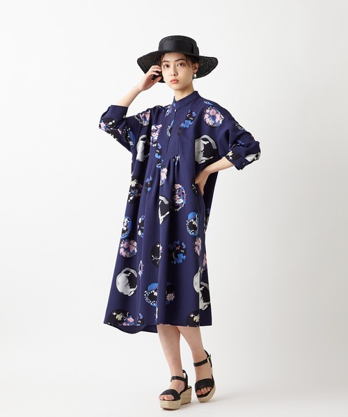 花天井の総柄のワンピース。華やかで心躍るバンドカラーのワンピース。 ミディ丈で動きやすく、ボディラインを気にせず気にせず着られるストレートラインのシルエットです。 少しおしゃれしたい日はもちろん、思い切って普段使いもして頂きたい1枚。 源には2つボタンがついていて、お好みで開けて少し衿を抜いての着こなしもおすすめです。ご自宅でのお洗濯が可能なイージーケアも嬉しいポイント。 7分袖なので、長い期間楽しめます。 ・サイズ感/フリー ・生地の厚さ/中肉 ・光沢感/なし ・ポケット/なし ※照明の関係により、実際よりも色味が違って見える場合があります。 またパソコン・スマートフォンなどの環境により、若干製品と画像のカラーが異なる場合もございます。 予めご了承ください。 【2021 SS collection】 キクマツバメ・花天井collection 「花天井」 神社やお寺にある花の天井。 古くからのものがそのままの姿で残されていたり、 現代の名匠によって色鮮やかに蘇ったり。 時代を超えて美しくあり続ける花天井を、新作のテキスタイルデザインにしています。 季節が沢山盛り込めるよう、椿や桃、牡丹以外に金魚や鳥や猫と多くのモチーフがデザインされていますので是非お楽しみください。