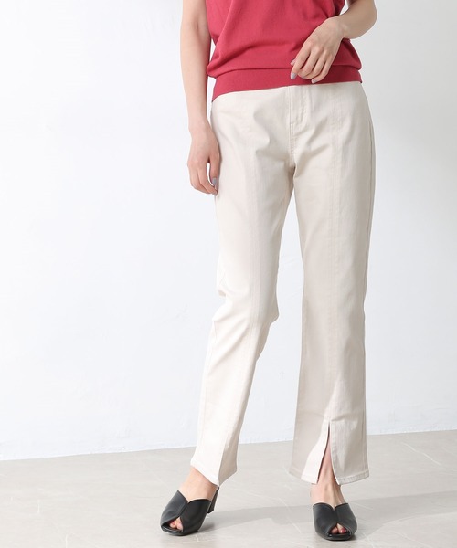 フロントスリットで、 今年らしさをプラスした デニムパンツ。 センターステッチとセミフレアのシルエットで、脚のラインがきれいに出るように仕上げました。 着回し力が高く、どんなトップスとも好相性◎ チュニックやワンピースなど、ロング丈アイテムとのレイヤードにもおすすめです。 品番:586-72-0288 洗濯:洗濯機使用可 ※サイズにつきましては若干の誤差が生じる場合がございます。予めご了承ください。 ※後ウエスト部分ゴム ※前中心ファスナー開き ※裾前中心スリットあり(14c)