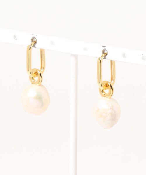パールとリングを組み合わせたデザインピアス。縦ラインを演出し、耳元で揺れるリュクスなデザインです。キャッチ部分はワンタッチで装着も簡単です。季節を選ばず、カジュアルにもパーティーシーンにもお使いいただけます。