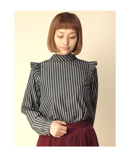 人気の肩フリルデザインのトップスに、ハイネック&ストライプ柄と秋冬のトレンドを落とし込んだアイテムです。