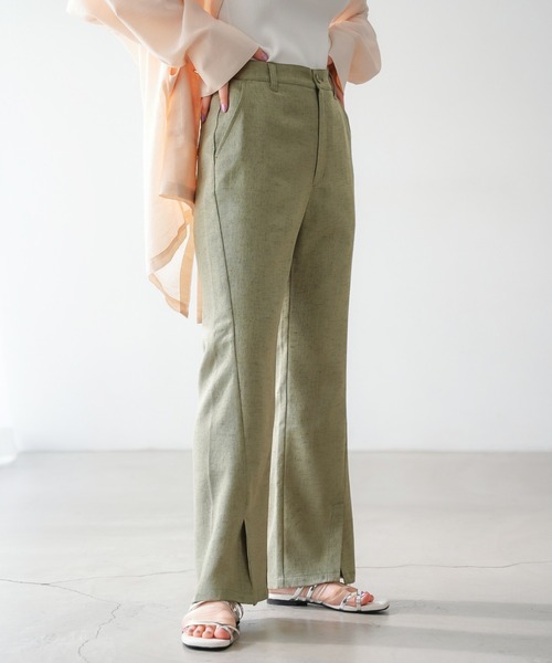 シャリ感のある麻調合繊素材を使用したフレアパンツトレンドのフレアシルエットにサイドからセンターにかけて入った切り替えと、フロントベンツがポイント。さらりとした風合いの清涼感のある生地でこれからの季節にもぴったりな一枚◎同素材でお作りしたトップスと合わせたセットアップ風のコーデもおすすめです。▼セットアップ対応アイテム・リネンライクカイキンフレンチスリーブシャツ(アイテム番号:949885)※デフォルトの画像が、実物と一番近い色味となります。※モニター・環境等により実際の商品と色味が多少異なって表示される場合がございます。 予めご了承をお願いいたします。