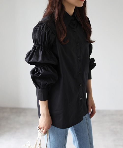 ★袖シャーリングシャツ★《スタイリング》デニムパンツやスキニーパンツ、スカートやワイドパンツなど様々なボトムスと相性抜群!羽織として使うのも◎《ディテール》トレンド感のあるシャーリングがおしゃれな印象に!シンプルすぎないデザインが◎