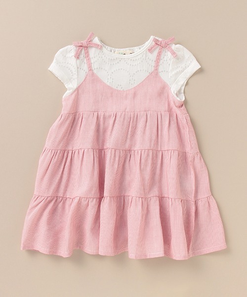 キレイめとガーリーを織り交ぜたレイヤード風のワンピースです。Tシャツに重ねたティアード状のキャミワンピは、ドラマティックな揺れ感を演出♪ 上身頃はドット柄の透かし編みになっているので涼しげな印象をプラスします。ドッキングデザインは着崩れしにくく、たくさん動いてもおしゃれをキープできる優れものです。