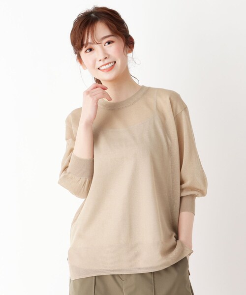 【デザイン】レイヤードスタイルが手軽に楽しめるシアーニットプルオーバーと、インナーキャミソールのセットアイテム。ニットトップスの袖と身頃はゆったりと仕上げ、ヒップまで届く程度の着丈でリラクシングな雰囲気に。【生地感】透け感のある軽やかな風合いのニットトップスと、肌触りのよいポリエステル素材のキャミソールのセットです。※複数枚のセット商品のため、洗濯表示・注意事項等は、本製品で御確認下さい。こちらの商品は主に夏に着用いただける商品です。モデル情報:身長166cm B83 W58 H85 着用サイズ:38(M)店舗へのお問い合わせ商品番号:763-12223●製品寸法:38(M):プルオーバー着丈59cm プルオーバーB104cm プルオーバー袖丈36cm プルオーバー肩幅44cm キャミソール総丈52~60cm キャミソール着丈41cm キャミソールB93cm40(L):プルオーバー着丈62cm プルオーバーB109cm プルオーバー袖丈37cm プルオーバー肩幅45cm キャミソール総丈54~62cm キャミソール着丈42cm キャミソールB96cm42(LL):プルオーバー着丈63cm プルオーバーB113cm プルオーバー袖丈37cm プルオーバー肩幅46cm キャミソール総丈55~63cm キャミソール着丈43cm キャミソールB98cm備考: