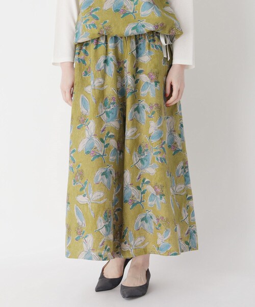 【デザイン】 リネンに手描きタッチのフラワープリントをのせた爽やかな定番スカーチョ。 スカートのフェミニンさとパンツの軽快さを絶妙にミックスさせました。 ウェスト部分は、穿き心地のよいリブを使用。ストレッチ感もありリラクシーに仕上げました。 ※ポケット数:横×2 【生地感】 リネン100%で通気性よく爽やかな穿き心地です。 程よい柔らかさに仕上げており、きれいな落ち感もあるのでシルエットがとてもきれいに見えます。 こちらの商品は主に夏に着用いただける商品です。 モデル情報:身長162cm B78 W60 H85 着用サイズF 店舗へのお問い合わせ商品番号:606-62017 ●製品寸法: F:W68cm H122cm 股下35cm 前股上48cm 渡り幅47cm 裾幅49cm 備考: