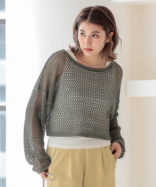 メッシュのざっくり透かし編みが可愛いサマーニットトップス。透け感があるので、インナーとのレイヤード次第で様々な印象をお楽しみいただけます。シンプルなワンピースや、シャツワンピースとの重ね着もオススメです◎【素材・サイズ感】涼しげな透かし編みがシーズンムード高まるアイテム。コンパクトな丈感なのでハイウエストのパンツやスカートとのバランスもとりやすく、コーディネートに使いやすいのが嬉しいポイント。