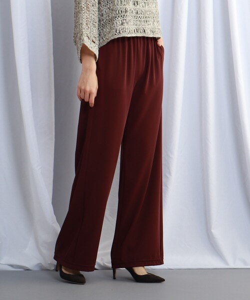 【JET LOSANGELES】 ゆとりがあるけど細く見せたい!その気持ちをこめて作ったスリムワイドパンツです。ウエストの仕様は夏にかけて楽チンにスッキリしたラインで履いていただけるようにパターンや仕様を拘って作っています。ゴムがウエストから見える仕様ですが、限りなく生地を減らして細く見えるように作ってあるのもポイントの1つです。腿から裾にかけてはやや細身のワイドパンツにすることによって足長効果が期待できます。また裾はゴムで絞ることが出来るので、今年トレンドの裾ドロストの2パターンのデザインを楽しむことが出来ます。さらっとした落ち感のある素材なので、肌に張り付きにくく夏場も着やすい一枚です。ディープブラウン、ベージュ、ネイビーの3色展開。ご自宅でケアが可能なのも嬉しいポイント。*紐を引っ張った際は紐が床についてしまうので紐先を軽く結ぶことをおすすめします。※ポケット数:横×2 ※裏地なし こちらの商品は主に夏に着用いただける商品です。 モデル情報:身長163cm B80 W60 H88 着用サイズ:04(M) 店舗へのお問い合わせ商品番号:C80-62005 ●製品寸法: 00(SS):W56cm H92cm 股下68cm 前股上28cm 渡り幅29cm 裾幅26cm 02(S):W59cm H95cm 股下70cm 前股上29cm 渡り幅30cm 裾幅27cm 04(M):W62cm H98cm 股下72cm 前股上29cm 渡り幅31cm 裾幅28cm 備考: